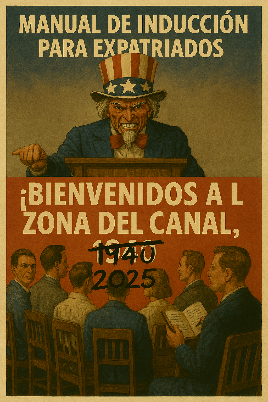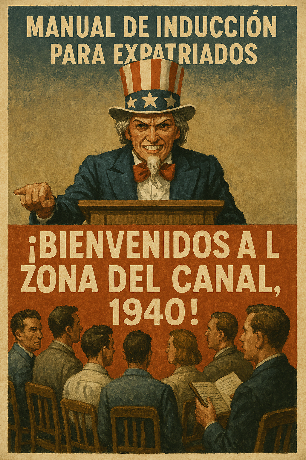 “Bienvenidos a la Zona del Canal, 1940” —dice Tía Sam. No sonríe: muestra los dientes. La mueca viene de un archivo militar, no de un catálogo. Postales que vendían prosperidad al precio del silencio.